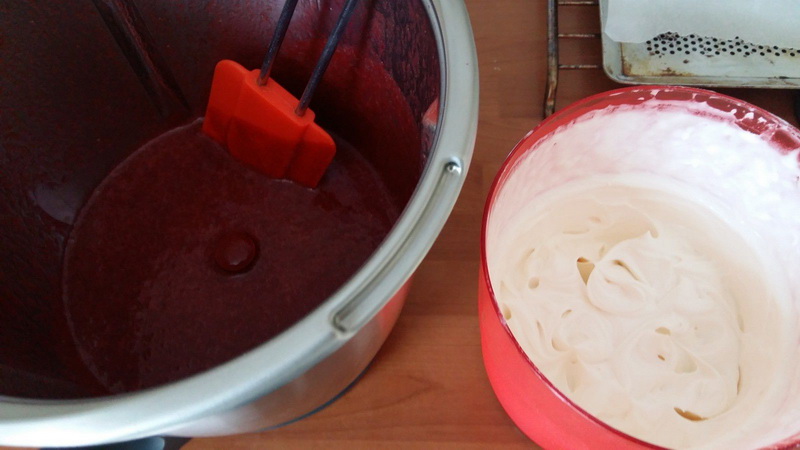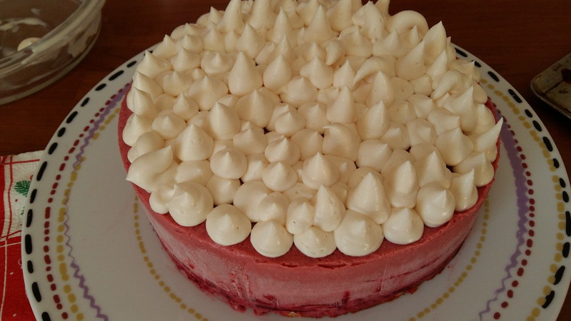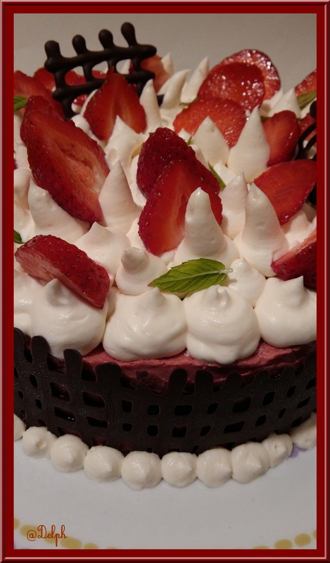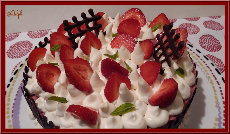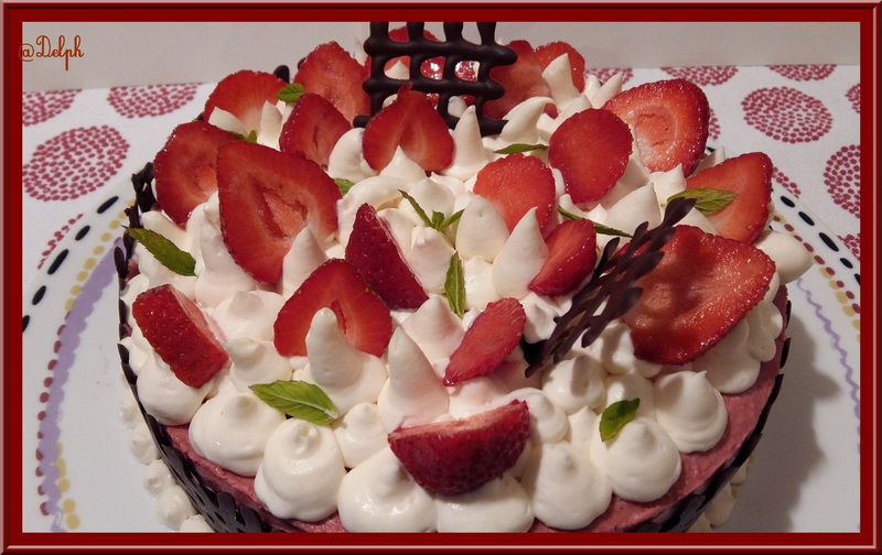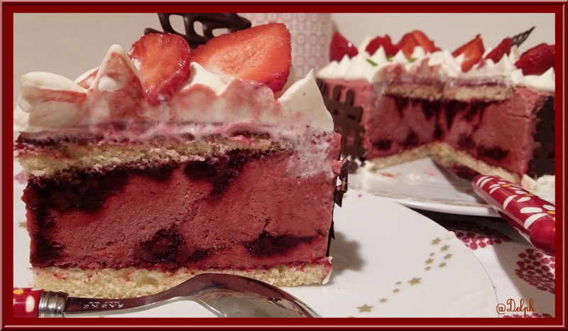 C’est une recette qui vient tout droit du site Cookidoo, il est normalement à la Framboise mais j’avais de la purée de fraises généreusement offert par Trésors de chefs j’ai donc changé de parfum, ajouté un insert et mis une double couche de génoise.