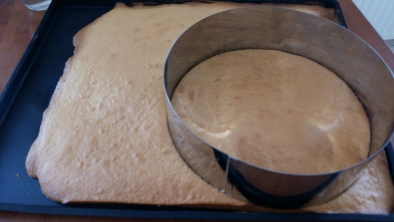 - A l’aide de deux cercles à pâtisserie de 16 et 22 cm détailler deux ronds de génoise.