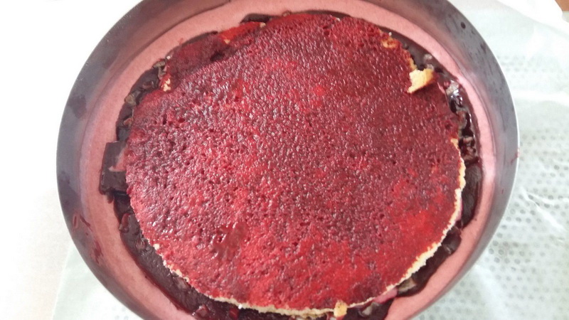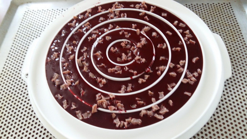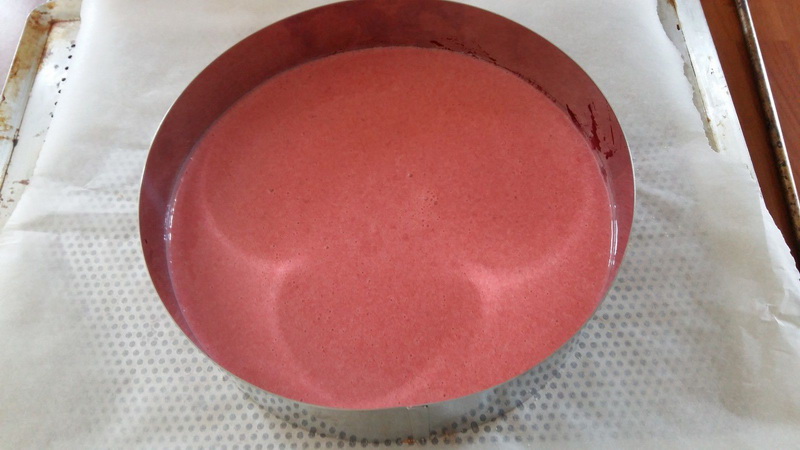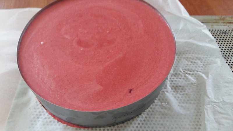 - Mettre la moitié de la préparation sur la plus grande génoise qui est au fond du cercle, placer votre moule au congélateur environ 30 minutes, au bout de ce temps, récupérer votre insert congelé, le mettre sur la première moitié de la mousse, recouvrir avec votre deuxième rond de génoise de 16 cm que vous aurez aussi imbibé de gelée de fraise puis recouvrir avec le reste de mousse puis remettre au congélateur pour environ trois heures votre entremets doit être bien congelé pour faire le reste.