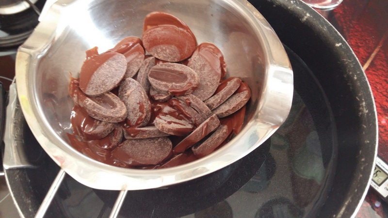 - Dès que la fonte du chocolat est bien avancée mais qu’il reste encore quelques pistoles entières retirer le récipient du bain-marie. À ce moment là le chocolat est à 40°C environ. Ne jamais aller au delà de 45°C.