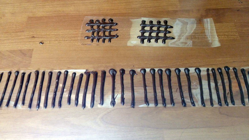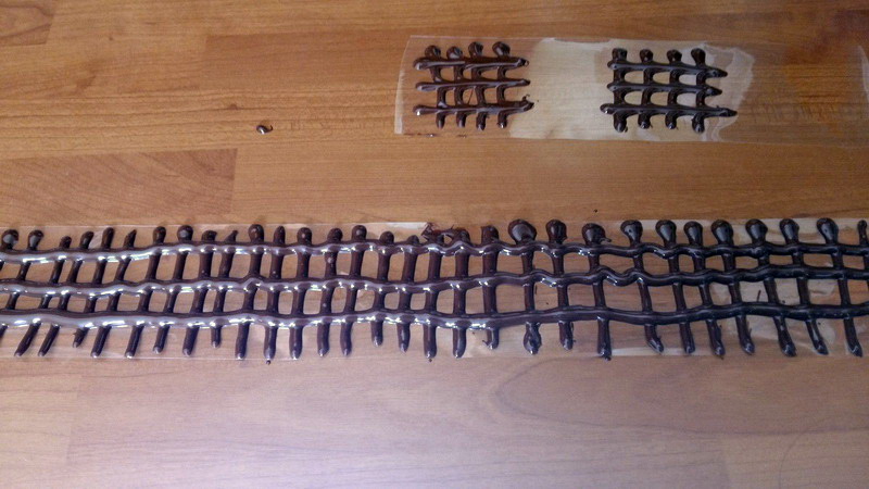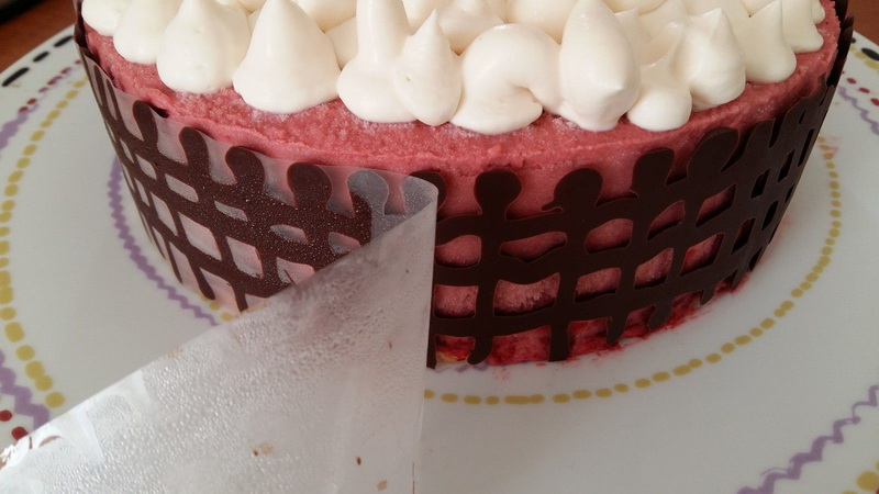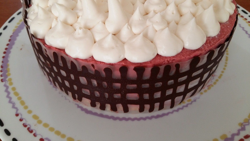 - Prendre une feuille guitare, la couper au diamètre du moule, mettre le chocolat dans un crayon de décoration et faire des traits verticaux, puis horizontaux pour faire un quadrillage ou autres formes, attendre que cela soit un peu refroidi pour l’appliquer sur le gâteau encore glacé, replacer l’entremets au frais et attendre que le chocolat durcisse; puis enlever la feuille guitare avant de présenter.