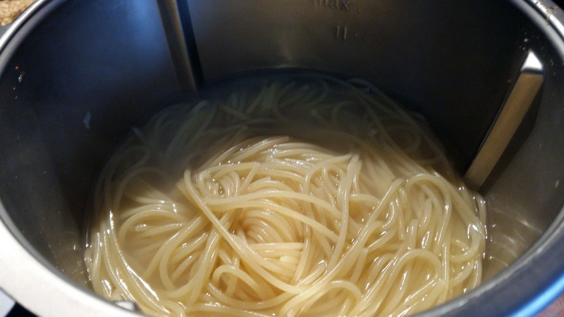 - Pendant ce temps faire cuire les pâtes, je n’ai pas rincer le bol, mettre 1200 g d’eau dans le bol puis faire chauffer 10min/100°C/vit1.