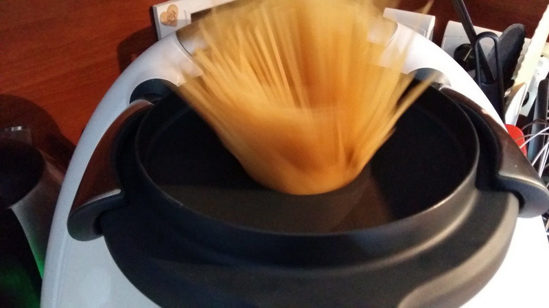 - Incorporer le sel et les pâtes par le gobelet puis faire chauffer 8min/100°C/Vit1.
