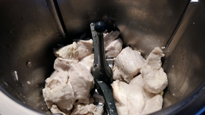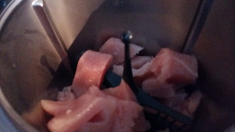 - Détailler la volaille en dés. Saler et poivrer à votre convenance, insérer le fouet dans le bol, verser l’huile d’olive et répartir la dinde des deux côtés du fouet puis faire chauffer 12min/105°C/couteau inversé/Vit mijotage sans le gobelet, à mi cuisson essayer de remuer la volaille avec la spatule pour que tous les cotés soient cuits. A la sonnerie, enlever le jus de cuisson puis réserver dans un plat allant au four.