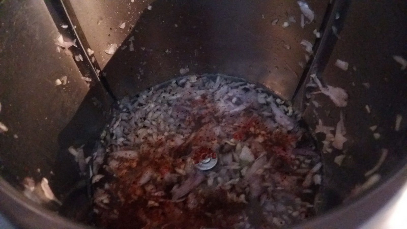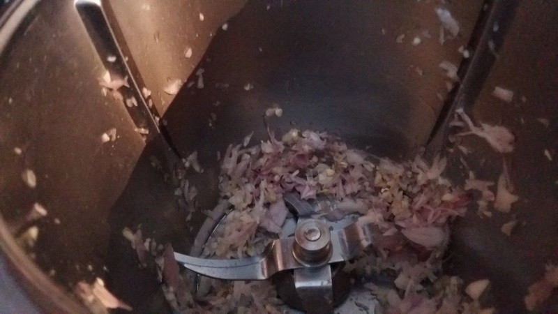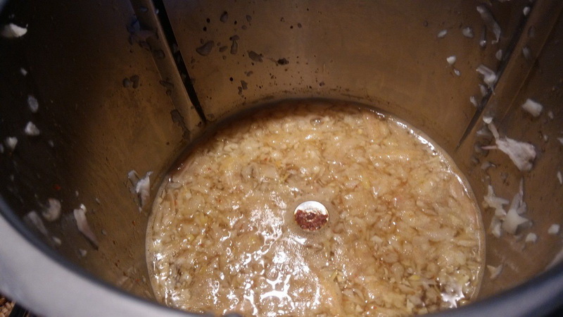 - Éplucher vos gousses d’ail et vos échalotes, les placer dans le bol et mixer 5sec/Vit5, ajouter le bouillon, le jus de citron, le piment d’Espelette puis faire réduire