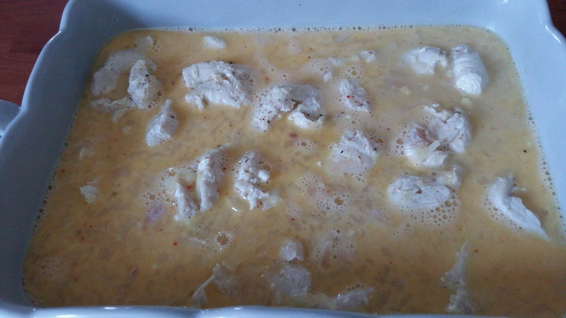 - Verser la sauce ainsi obtenue sur les dés de volaille, et mélanger de façon à ce que tous les morceaux soient bien recouverts de sauce.