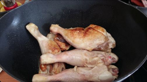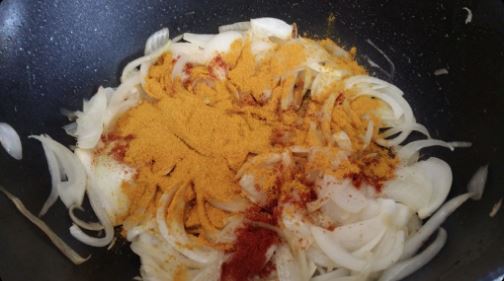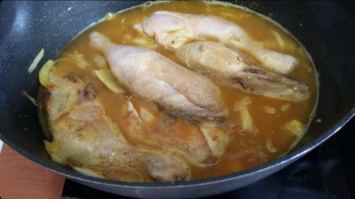 - Enlever vos cuisses de poulet colorées, puis mettre à la place les oignons, les faire revenir environ 10 minutes, en remuant régulièrement, mettre vos épices, colombo et piment doux, puis vos cuisses de poulet. Couvrir d’eau chaude, mélanger un peu, puis faire cuire à couvert sur feu doux pendant environ 1 heure.