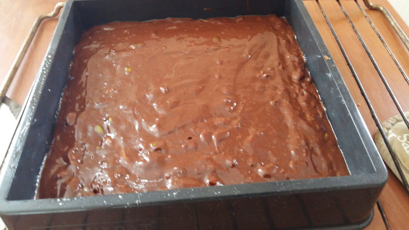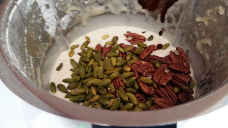 - Battre les œufs entiers et le sucre jusqu’à obtenir un mélange légèrement mousseux. Ajouter la farine et fouetter 2 minutes puis ajouter les noix de pécan et les pistaches que vous aurez grossièrement hachés. Puis incorporer le chocolat fondu.