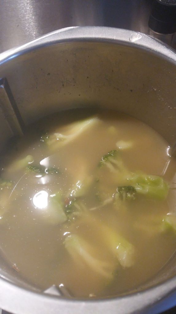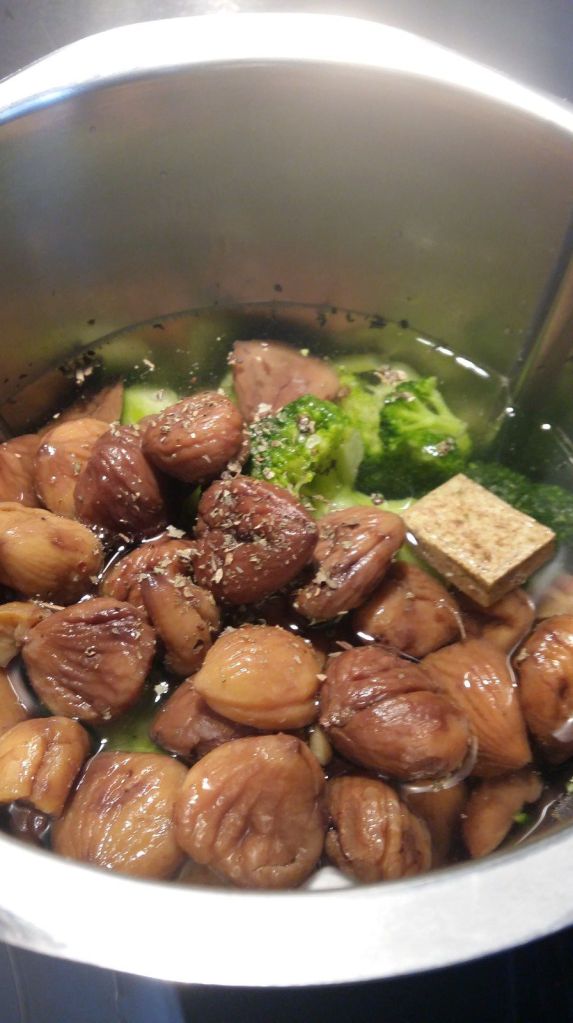 - Mettre dans le bol du Thermomix, le brocolis, les châtaignes, l’eau, le sel, le poivre et le bouillon cube, puis programmer 20min/Varoma/ Vit mijotage.