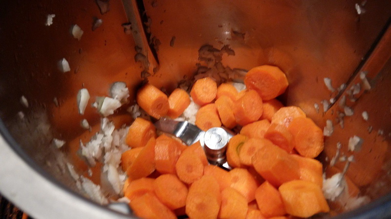 - Éplucher vos oignons, les couper en deux, les mettre dans le bol puis mixer 5sec/Vit5, ajouter l’huile d’olives, éplucher et laver vos carottes, les couper en rondelles, les mettre dans le bol, puis les faire cuire 6min/100°C/couteau inversé/vit mijotage.