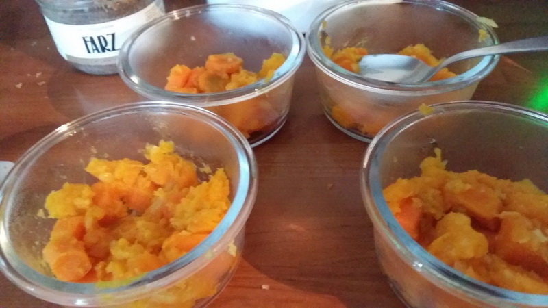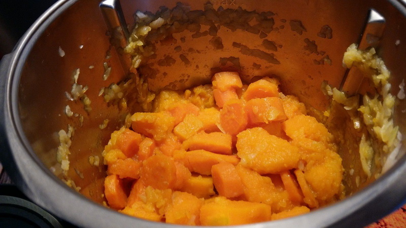 - Pendant ce temps éplucher et couper en dés votre potiron, vous les ajouterez à la sonnerie dans le bol, avec l’assaisonnement sel, poivre et épice puis poursuivre la cuisson 8 min/100°C/couteau inversé/vit mijotage.