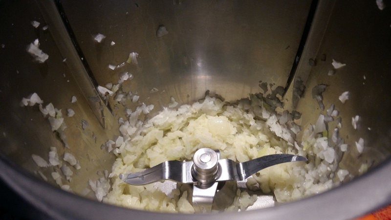 - Éplucher les oignons, les couper en deux, les mixer 5sec/vit5, racler les bords et ajouter l’huile d’olive faire revenir 3min/100°C/vit mijotage.