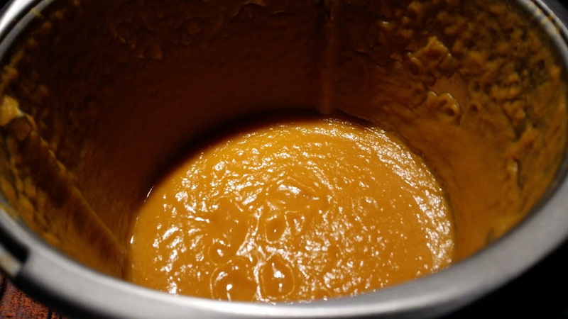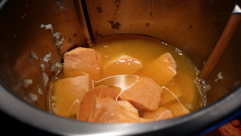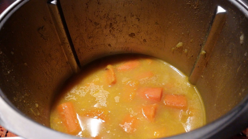 - Éplucher les carottes, les couper en rondelles, éplucher la patate douce et la couper en gros dés, les ajouter à l’oignon, couvrir d’eau, ajouter les épices, le sel et le poivre, fermer votre cocotte puis faire chauffer une vingtaine de minutes.