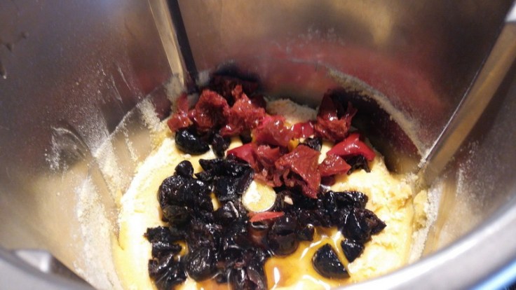 - Mettre les œufs avec le yaourt et l’huile puis mixer 30sec/vit3, ajouter la farine et la levure puis mélanger à nouveau 30sec/vit3, incorporer le parmesan, les olives et les tomates et mixer 30sec/couteau inversé/vit2.