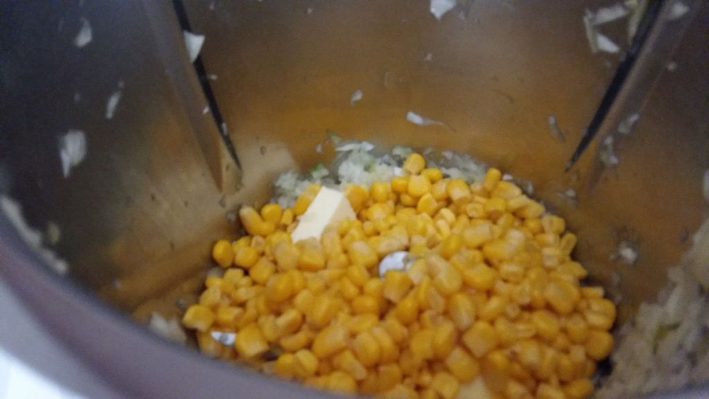 - Éplucher et couper l’oignon en 4 puis mixer 5sec/vit5 , ajouter le beurre et le maïs puis faire revenir 4min/100°C/vit mijotage.