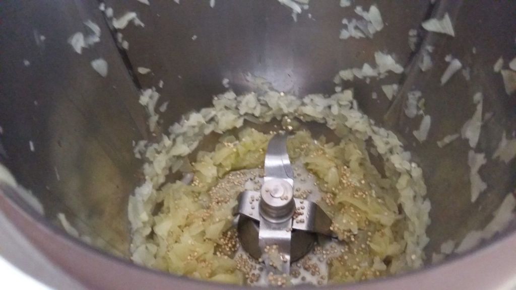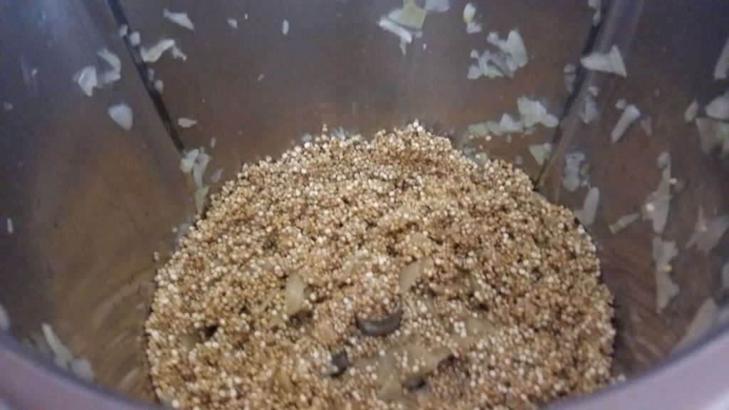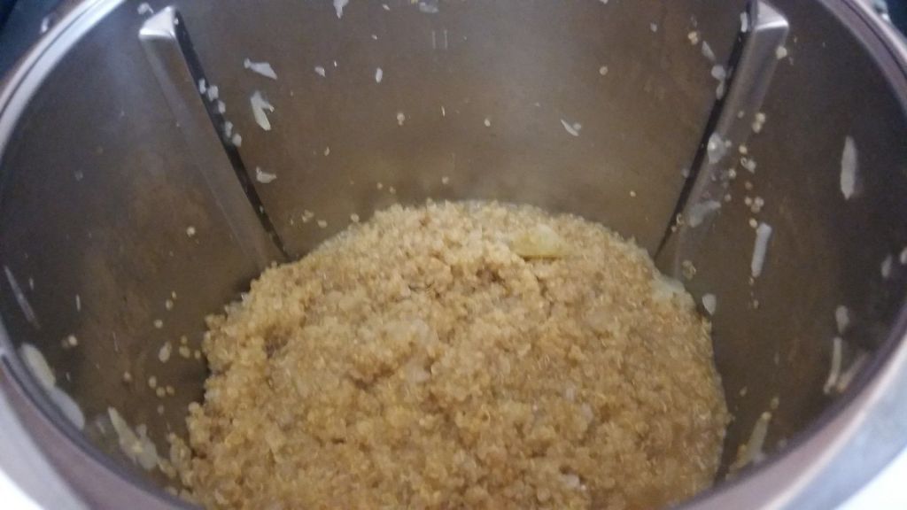 - Ajouter le quinoa bien égoutté, faire chauffer 3 min/100°C/ couteau inversé /vitesse 1, sans le gobelet.