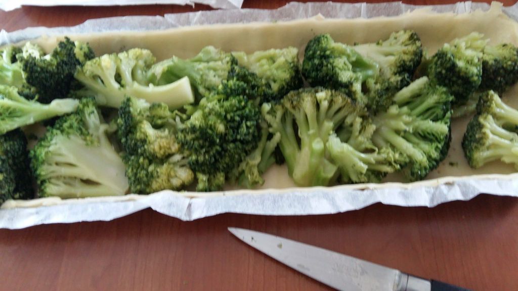 - Disposer votre pâte dans votre moule, la piquer à l’aide d’une fourchette, puis déposer vos bouquets de brocolis.
