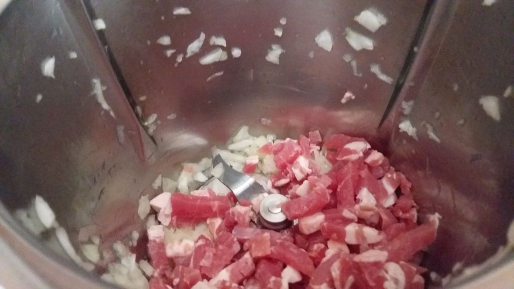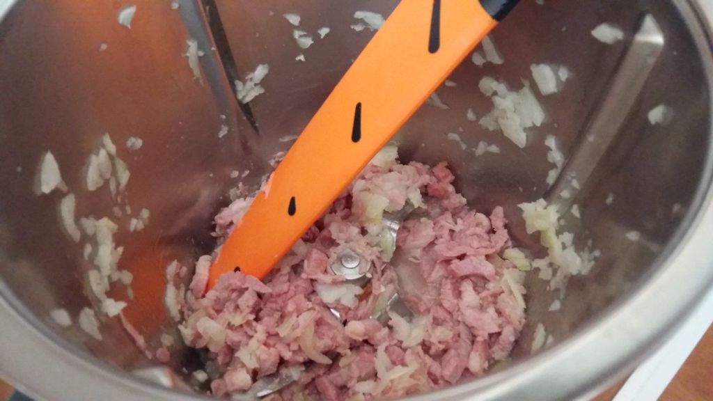 - Rincer votre bol, éplucher votre oignon et le couper en deux, mixer 5sec/vit5, racler les bords, ajouter les lardons puis faire revenir 4 min/100°C/couteau inversé/vit mijotage. A la sonnerie, enlever le maximum de gras rendu par les lardons puis répartir cette préparation sur la pâte.