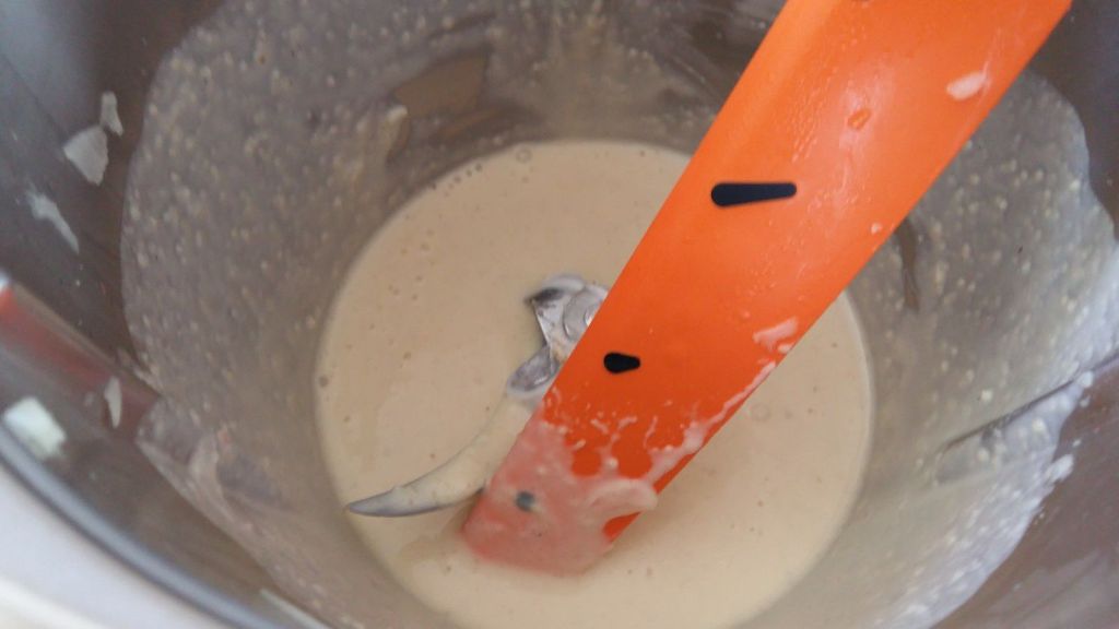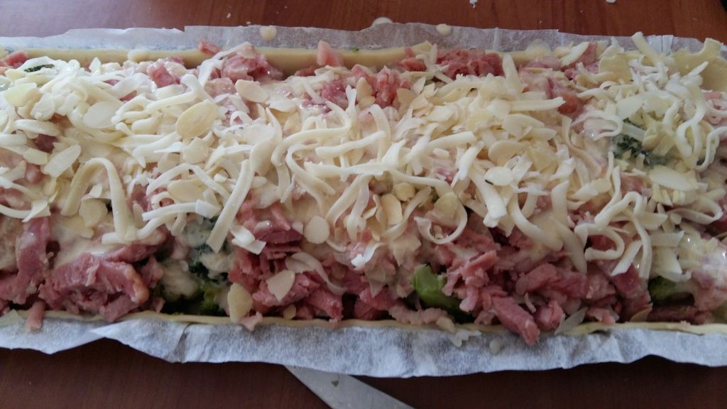 - Inutile de rincer le bol, mettre la crème, l’œuf, la crème et la poudre d’amandes, le poivre, un peu de sel ( pas trop les lardons le sont assez) et le piment d’Espelette puis mélanger 30sec/vit3. Verser sur les brocolis et les lardons.