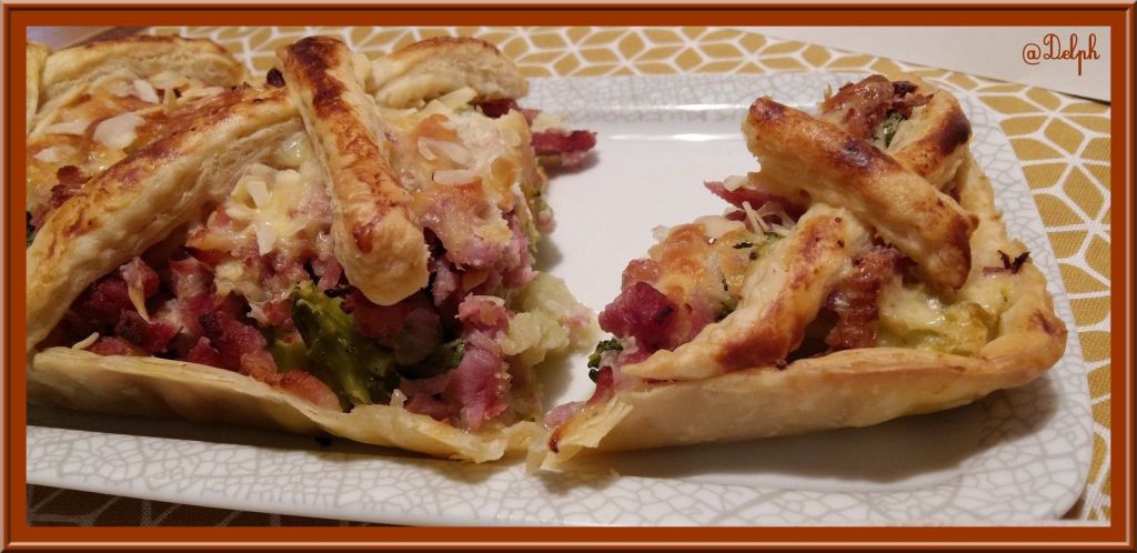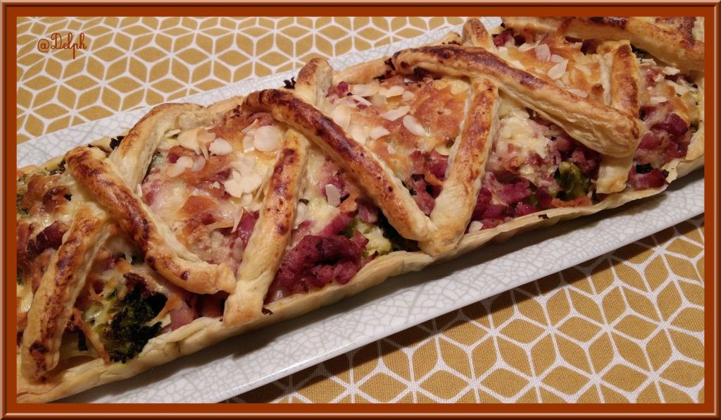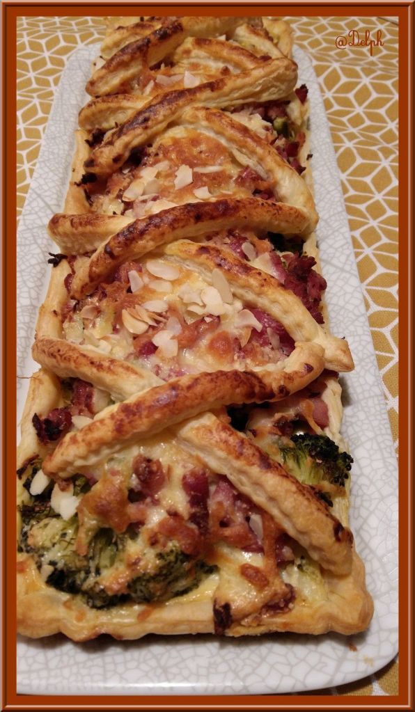 Cette tarte est délicieuse, je l’ai présentée en forme rectangulaire, j’ai donc un peu diminué les doses de l’appareil, voici le lien d’Estelle, pour une tarte ronde. J’ai aussi ajouté un oignon et des amandes effilées.