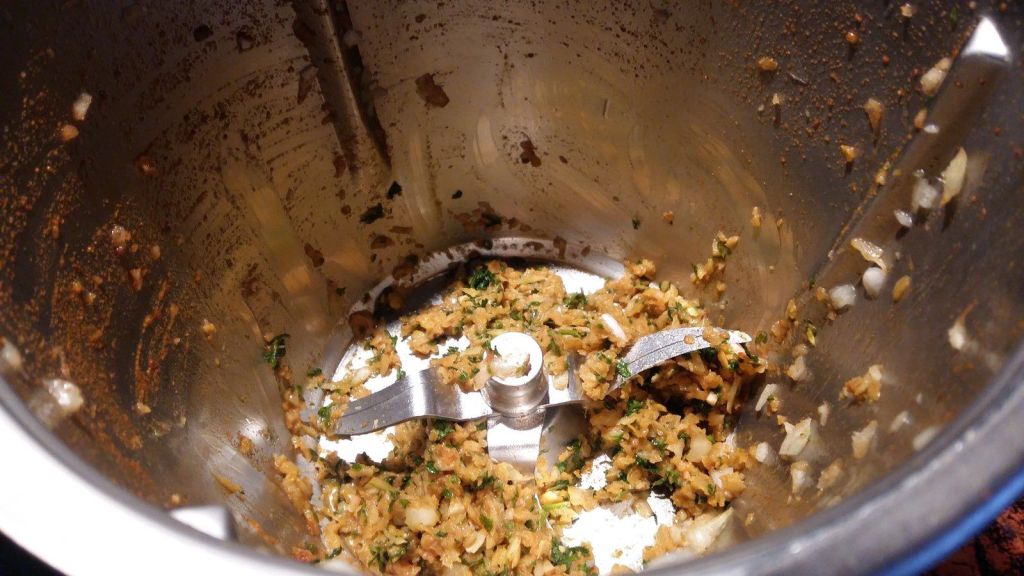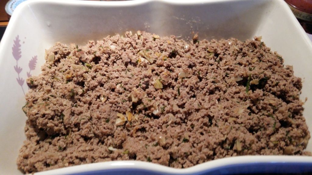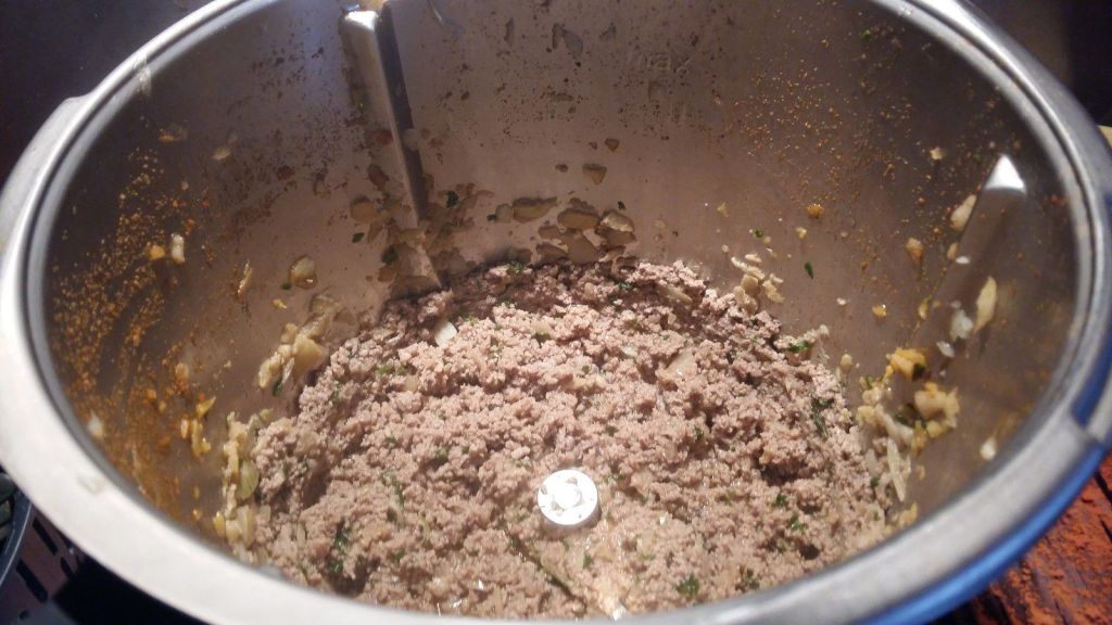 - Mettre dans votre bol, le persil lavé et séché sans les queues, avec l’oignon, épluchés et couper en deux, mixer 5sec/vit7, racler les bords, ajouter l’huile d’olive, le paprika et le piment doux puis faire revenir 4 min/90°C/Vit mijotage, ajouter le bœuf haché et faire revenir 5 min/100°C/couteau inversé/Vit1. A la sonnerie enlever le jus de cuisson puis disposer votre viande dans un plat à gratin.