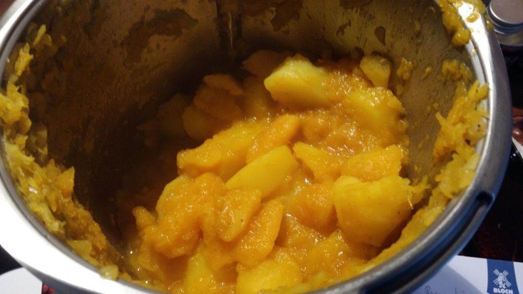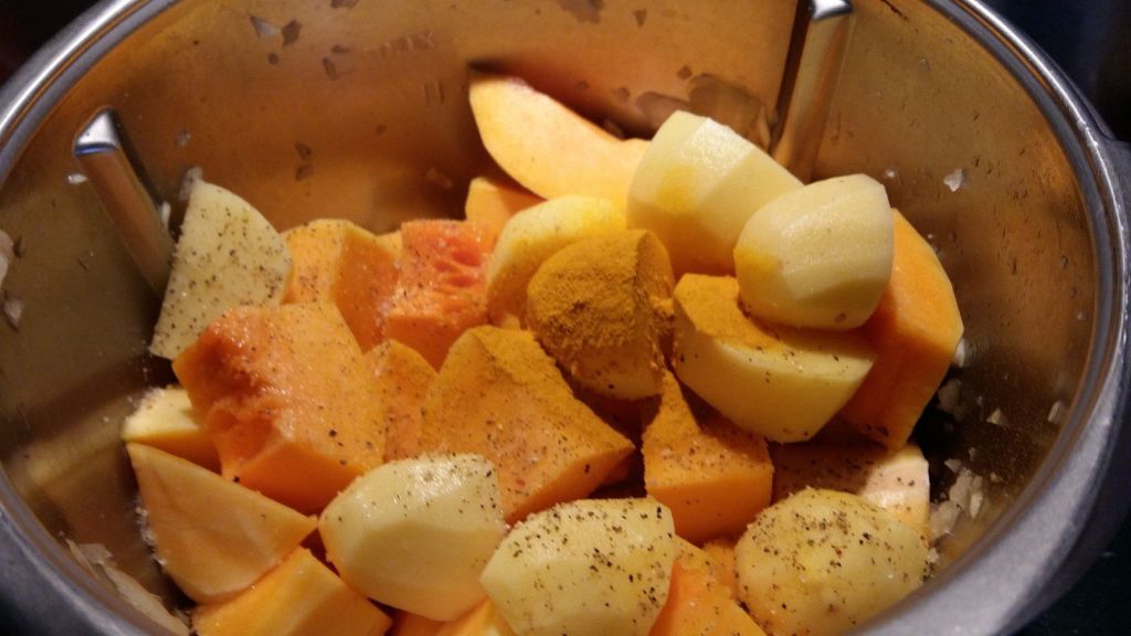 - Éplucher l’oignon et le mettre dans le bol , mixer 5 sec vit 5, puis racler les parois du bol. Éplucher la butternut avec un économe et le couper en dés, faire pareil pour les pommes de terre. Les mettre dans le bol avec le sel, le poivre et le curcuma et 1/2 gobelet d’eau faire chauffer 20min/100°C/couteau inversé/vit1.