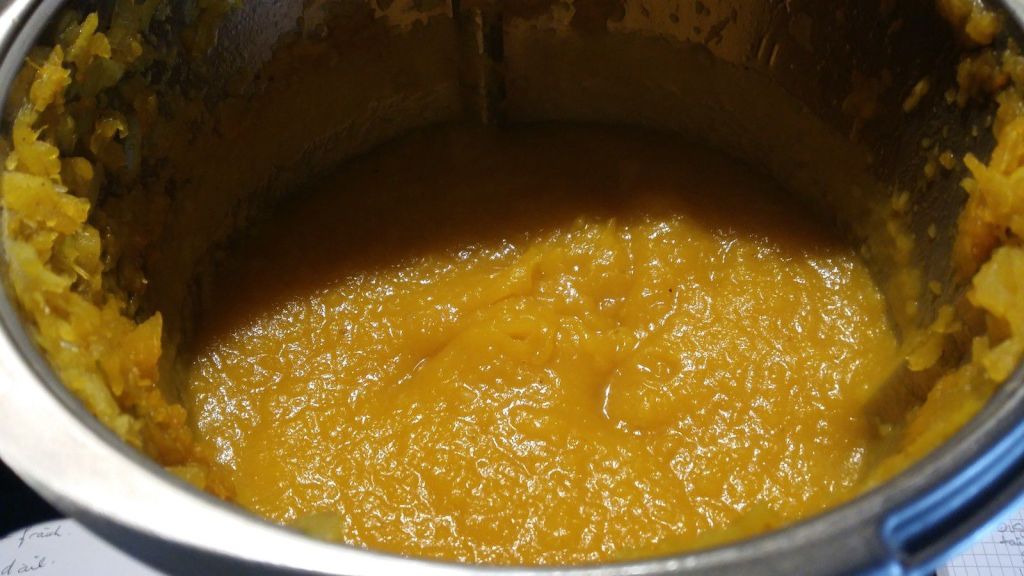 - A la sonnerie, enlever le maximum d’eau rendue par la courge puis mixer 10 sec/vit 6