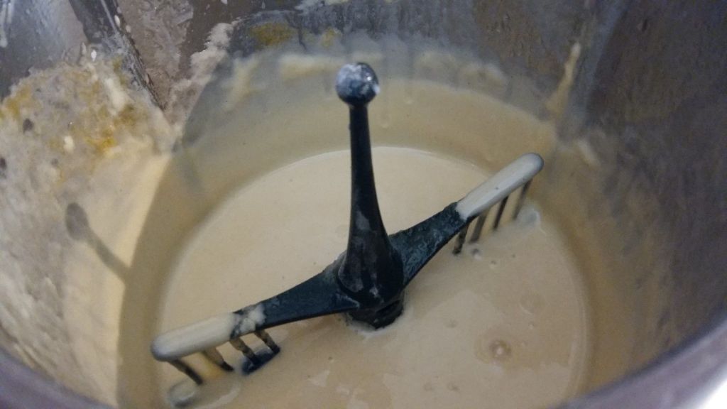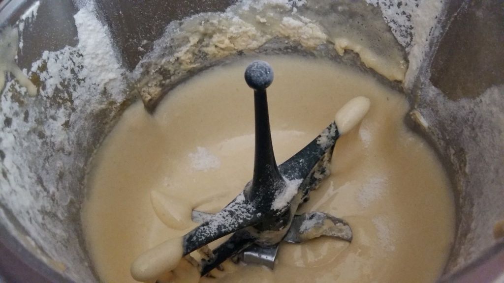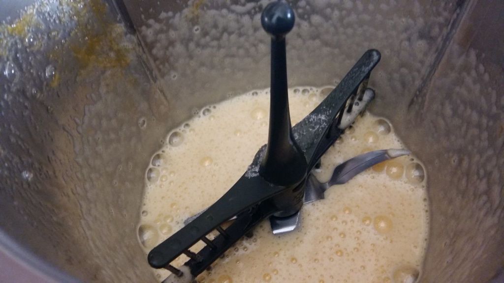 - Insérer le fouet (on le laisser toute la recette) dans le bol puis mettre les œufs et le sucre, blanchir 1min/vit3, ajouter la farine et la levure, puis mixer 30sec/vit3, ajouter le lait, l’huile et le sirop puis mélanger 30sec/vit3.