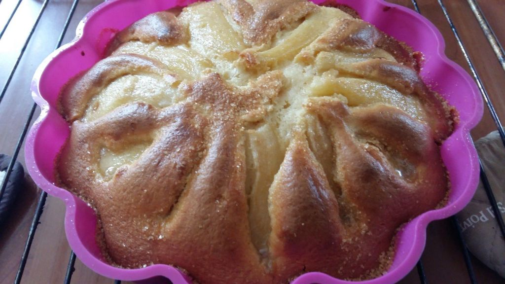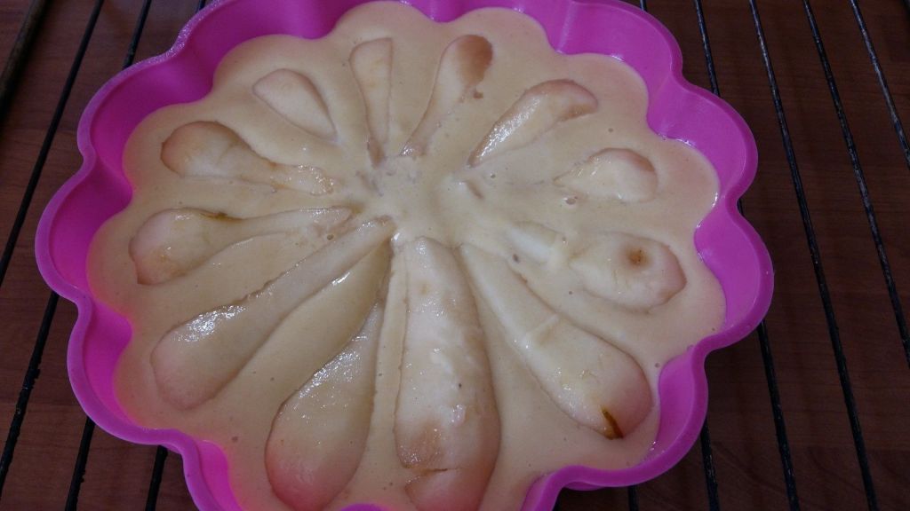 - Éplucher les poires, couper les en 4 quartiers et les disposer sur la pâte en formant une rosace.