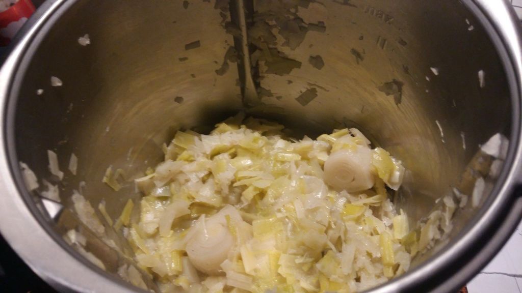- Ajouter les blancs de poireaux lavés et coupés en rondelles, 1 gobelet doseur d’eau, 1 gobelet doseur de vin blanc avec le sachet d’épices dans le Thermomix et faire cuire 15 min/115°c/couteau inversé/ vitesse 2.