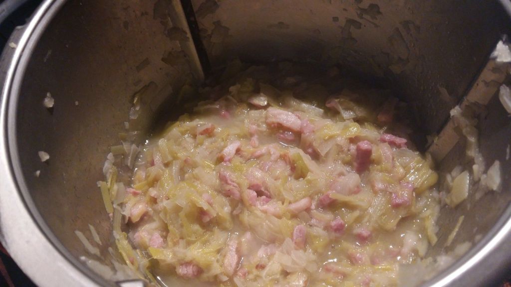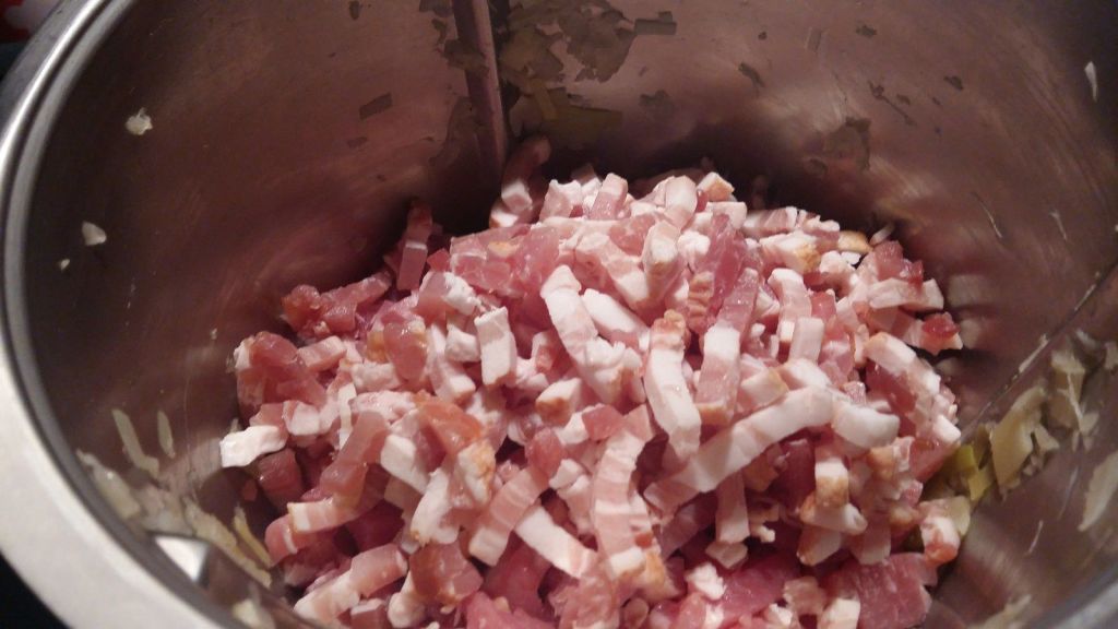 - A la sonnerie ajouter les lardons puis poursuivre la cuisson pendant 5 min/115°c/couteau inversé/ vitesse 2.