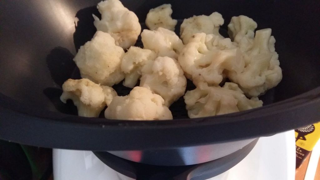 - Laver le chou-fleur et détacher les bouquets, les mettre dans le Varoma. Mettre l’eau dans le bol avec le bouillon cube, mettre le couvercle et installer le Varoma avec le chou-fleur, programmer 30min/varoma/Vit2. A la sonnerie, déposer le chou dans un petit moule à gratin puis rincer votre bol.