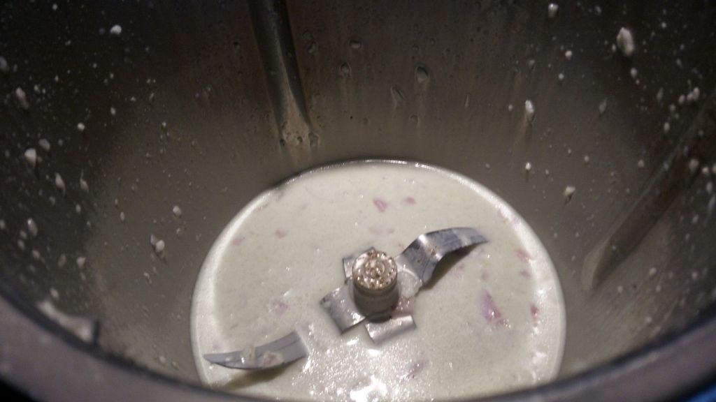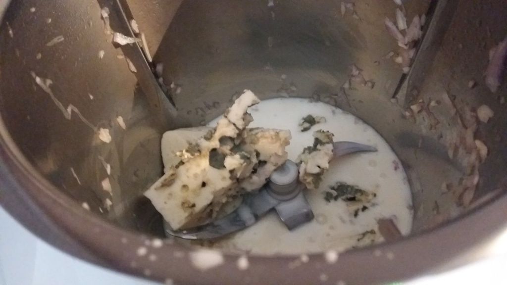 - Éplucher et couper en deux vos échalotes, les mettre dans le bol puis mixer 5sec/vit5, racler les bords, ajouter l’huile d’olive et faire revenir 3min/90°C/vit1, ajouter la crème liquide, le roquefort coupé en morceaux et du poivre puis cuire 3min/60°C/Vit2, puis mixer 20sec/vit3.