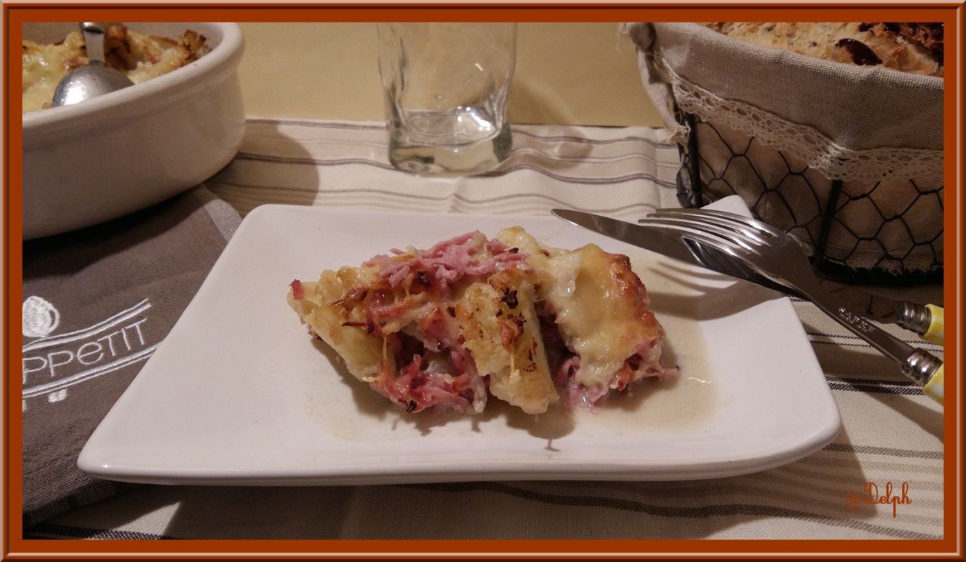 - Dans le moule à gratin, ajouter le jambon râpé, mélanger puis recouvrir de la sauce au roquefort, parsemer de Comté râpé.