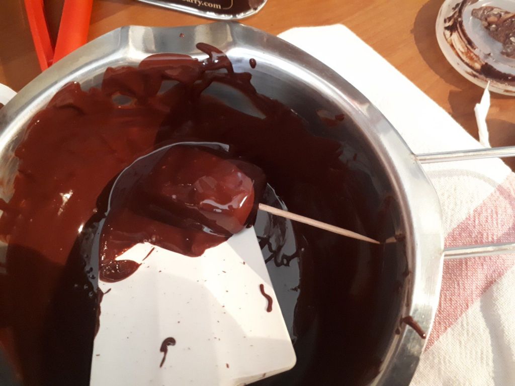 - Mettre un petit cure dent sur les formes de pâte d’amande puis les tremper rapidement dans le chocolat.