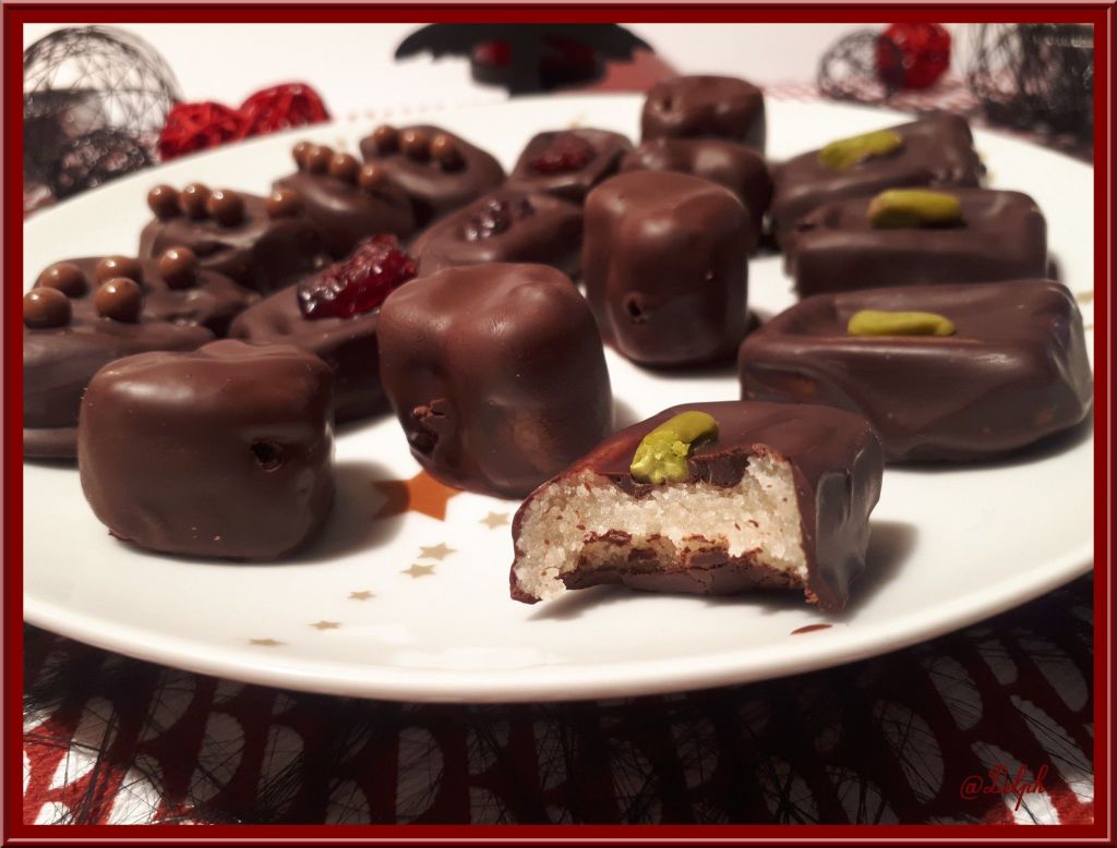 C’est ma gentille Martine du superbe blog Kilomètre-0 qui m’a donné envie de faire ces petits chocolats. Je suis une grande fan de pâte d’amande et maintenant que je la réalise maison, je ne prive pas pour me régaler avec. J’ai choisi de laisser ma pâte d’amande blanche mais vous pouvez la colorer avec une goutte de colorant.