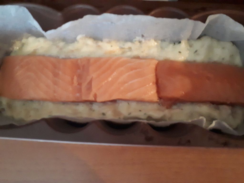 - Ajouter la crème et mélanger 20 sec/vit4. Transvaser la moitié de la farce obtenue dans le moule à cake. Poser les 2 morceaux de saumon dessus en mes centrant, puis ajouter le reste de la farce. Couvrir de papier cuisson.