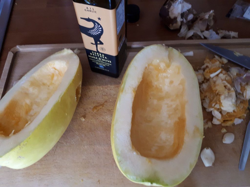 - Avec un pinceau, badigeonner tout l’intérieur de la courge d’un peu d’huile d’olive, saler, ajouter une gousse d’ail dans chaque demi-courge, un feuille de laurier et une petite branche de thym, recouvrir d’une feuille d’aluminium.
