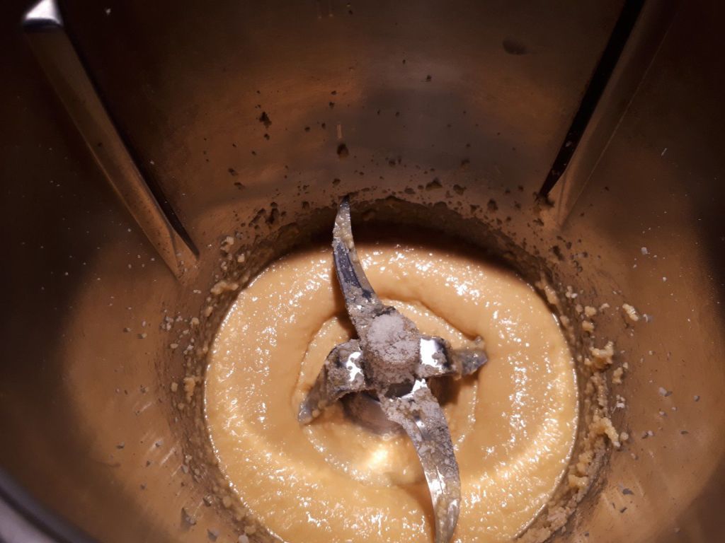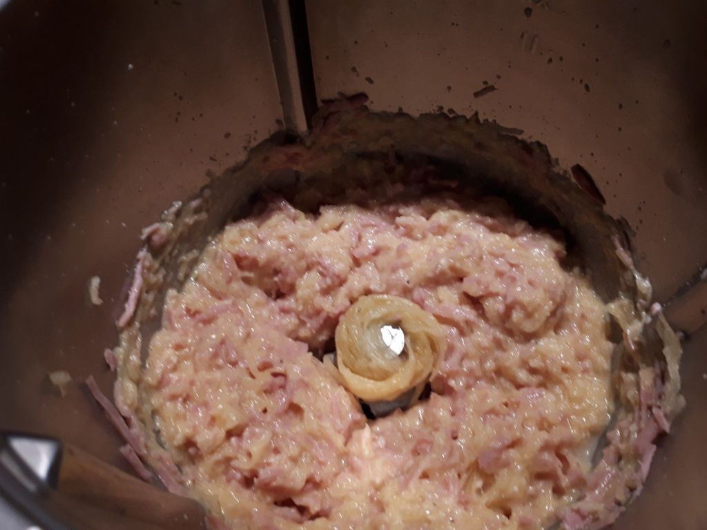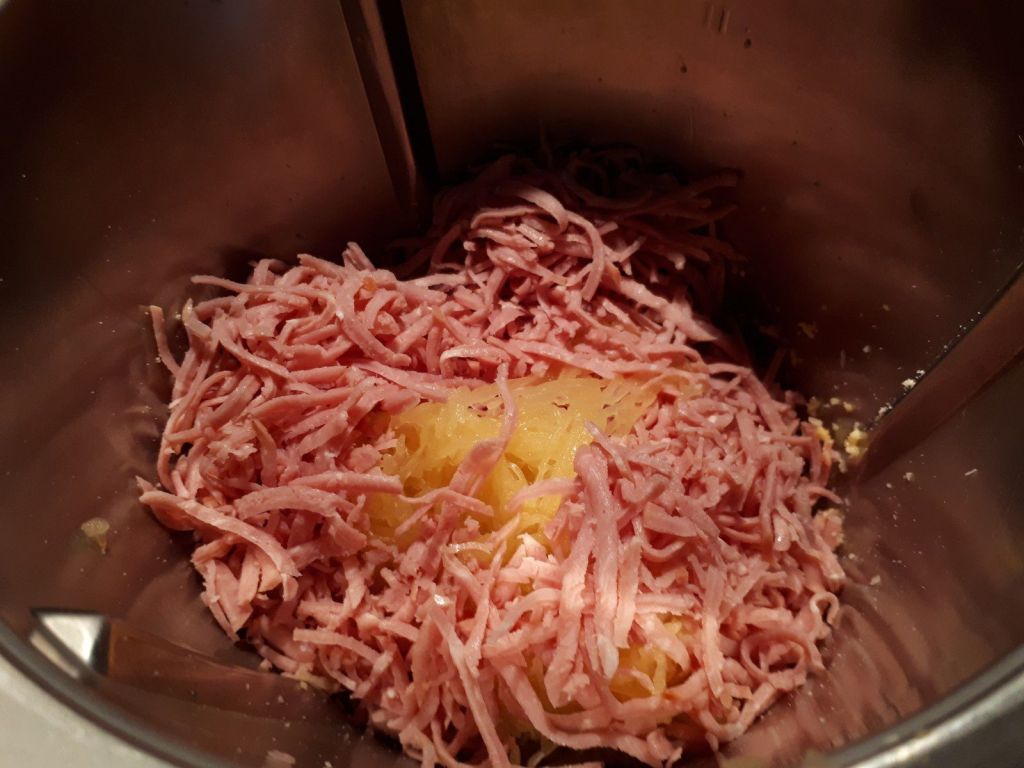 - Dans le bol déposer vos jaunes d’œufs et le parmesan puis mélanger 40sec/vit3, ajouter la chair de la courge, le jambon fumé râpé, poivrer et mélanger 30sec/vit3.