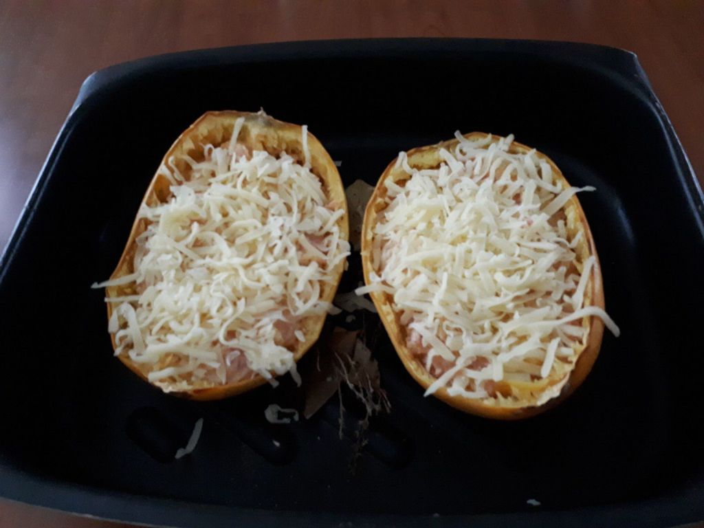- Verser la préparation dans chaque demi coque de courge, tasser à l’aide du dos d’une cuillère et saupoudrer de mozzarella râpée.