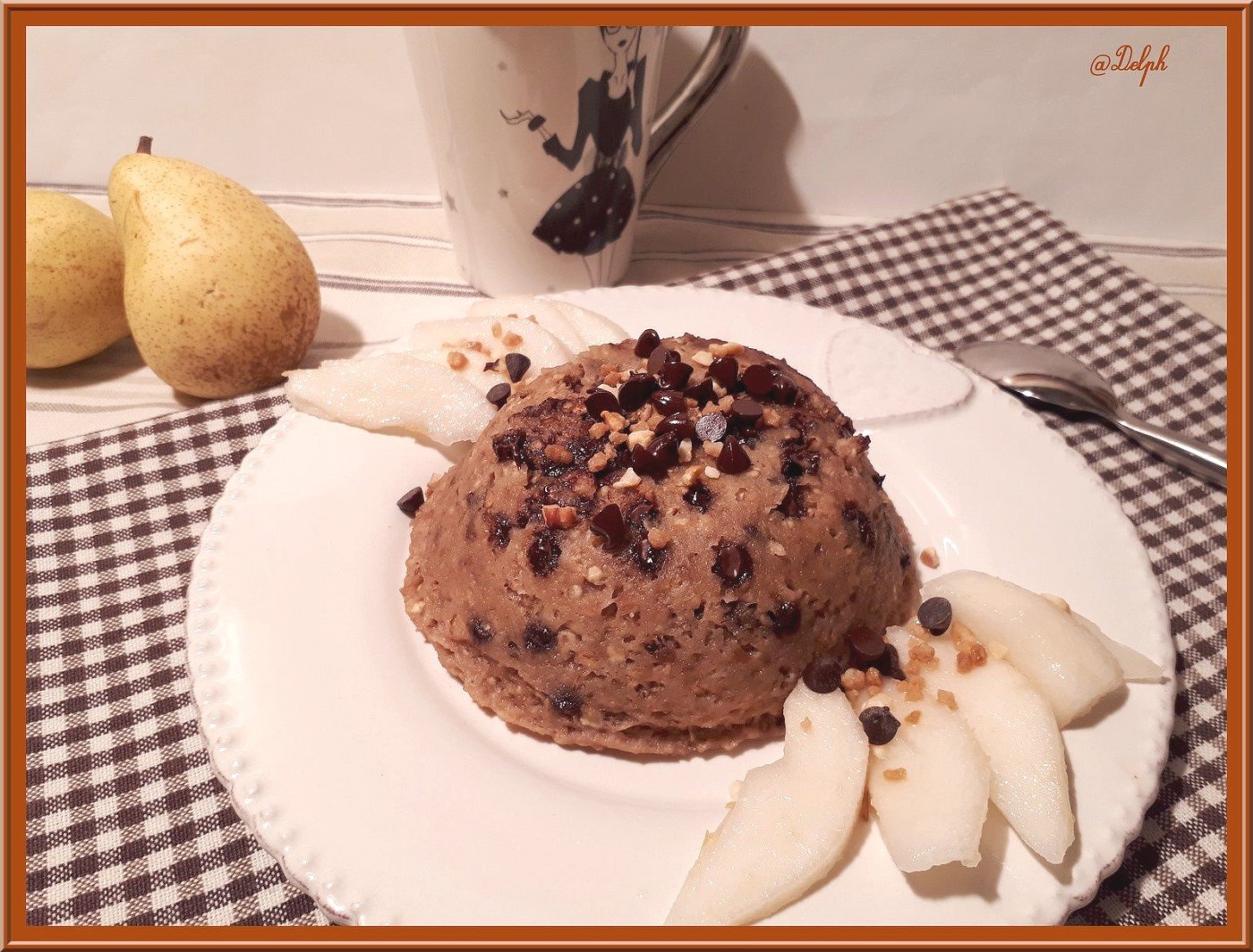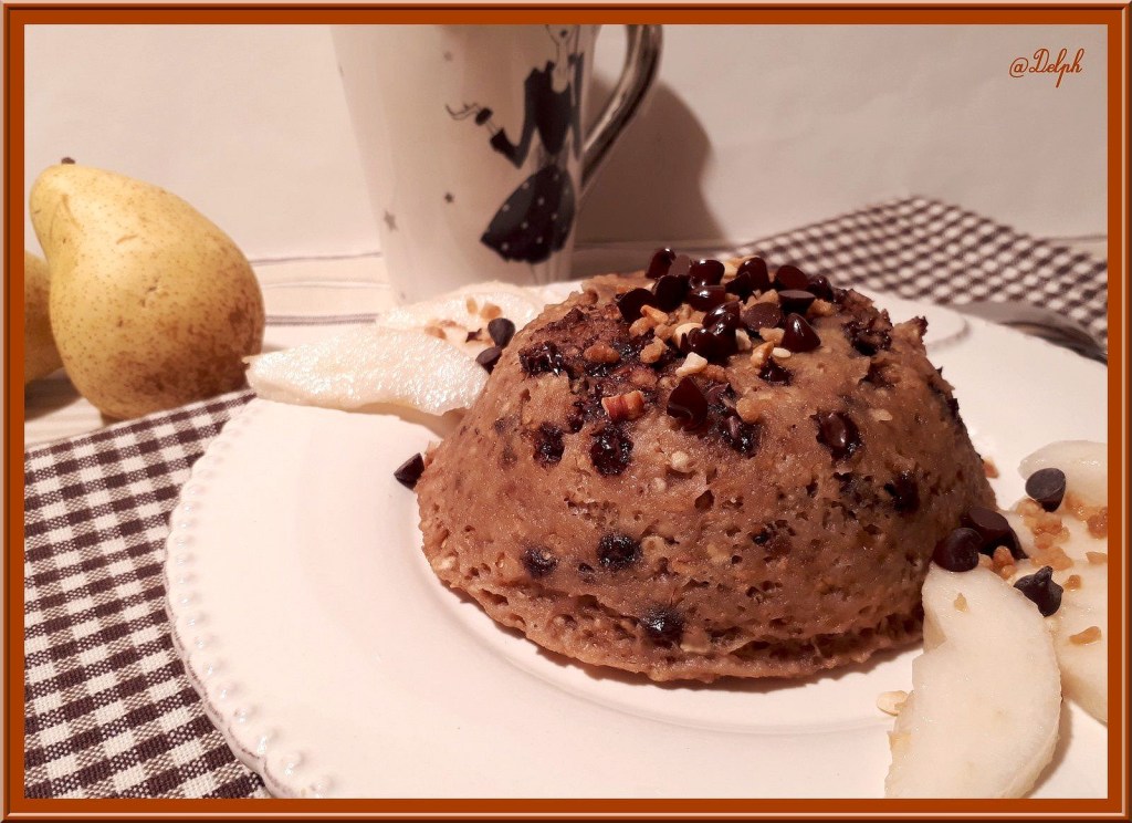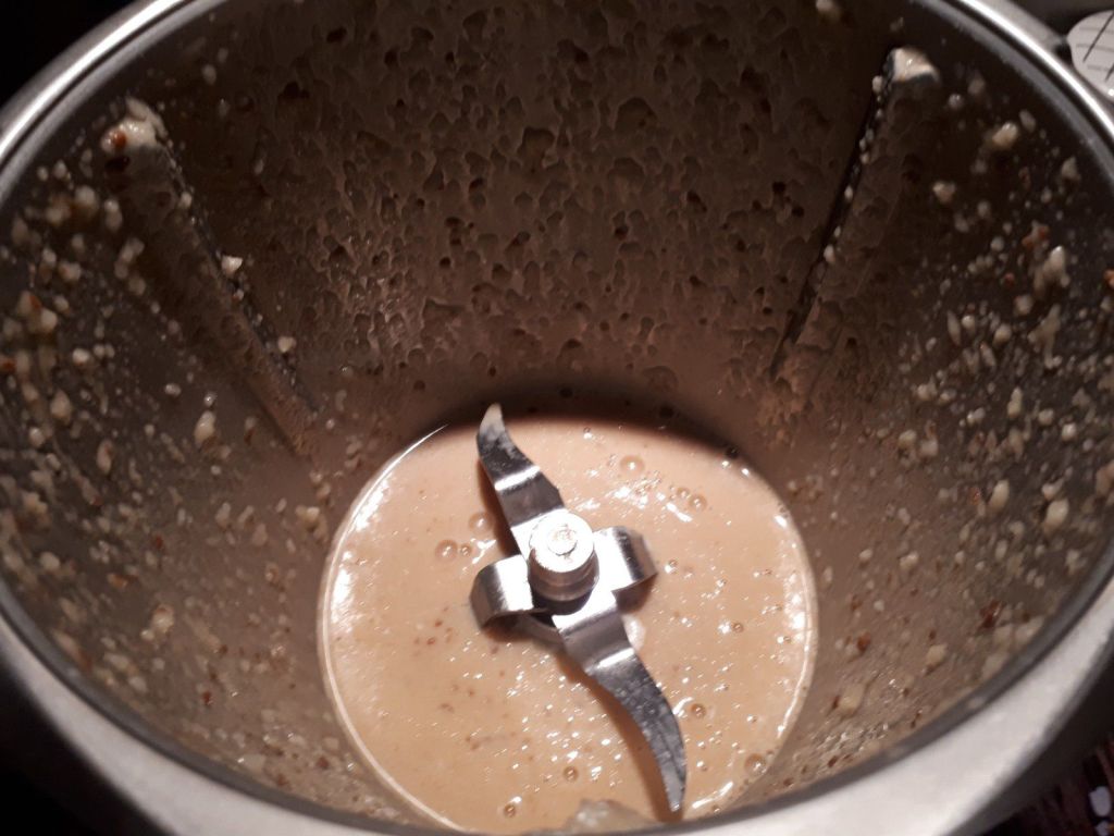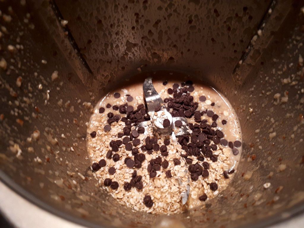 - Éplucher la poire la couper en 2, enlever les pépins, la mettre dans le bol avec l’œuf, le lait, le sirop d’érable, le praliné et la levure et mixer 40sec/vit4, ajouter les flocons d’avoine, les pépites de chocolat et mélanger 20sec/couteau inversé/vit3.