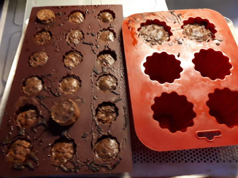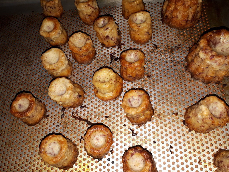 5. Ajouter le magret fumé dégraissé et mélanger 20 sec/couteau inversé /vitesse 3. ( je trouvais qu’il y avait de trop gros bouts de magret j’ai donc ajouté 10sec/vit3. Répartir dans 25 moules à mini-cannelés disposés sur une plaque de four.