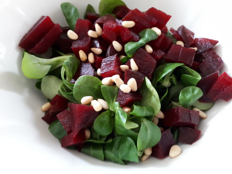 - Laver et nettoyer votre salade de mâche, éplucher et couper vos betteraves en petits cubes, les mélanger à la salade de mâche.