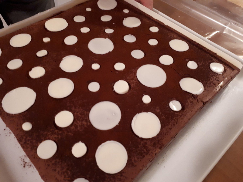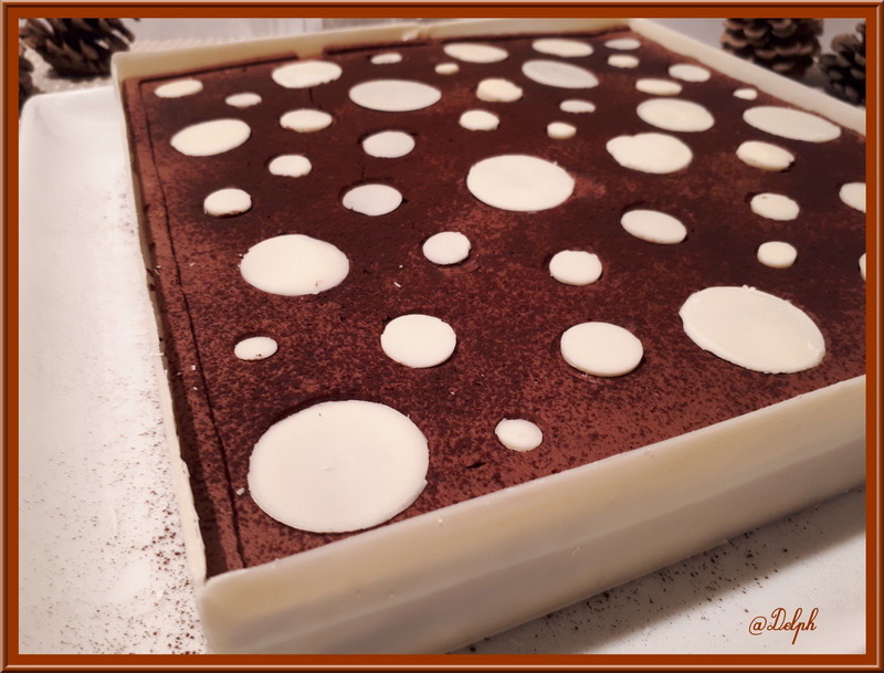 - Avant de déposer mes cercles en chocolat blanc, j’ai parsemé de poudre de cacao avec une passoire fine.