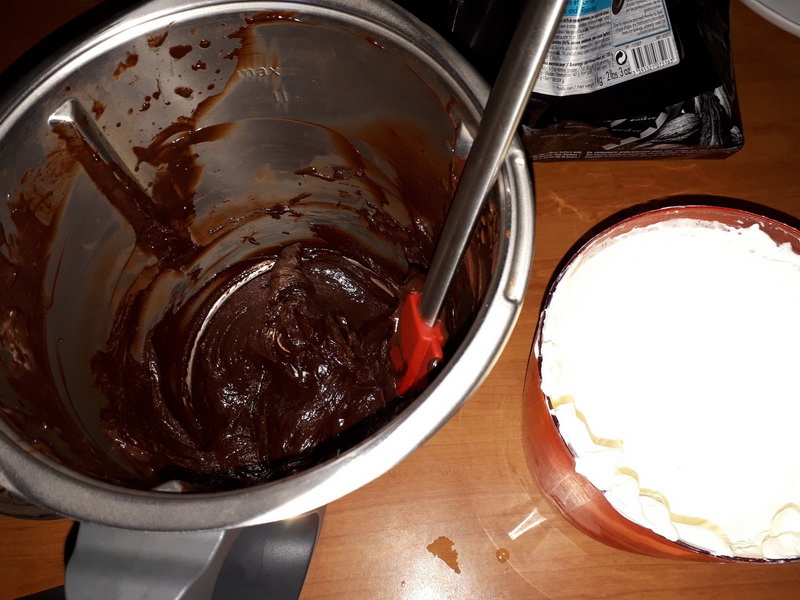 - Mélanger 1/3 de la crème avec la ganache préalablement réalisée. Ajouter le reste de la crème montée.