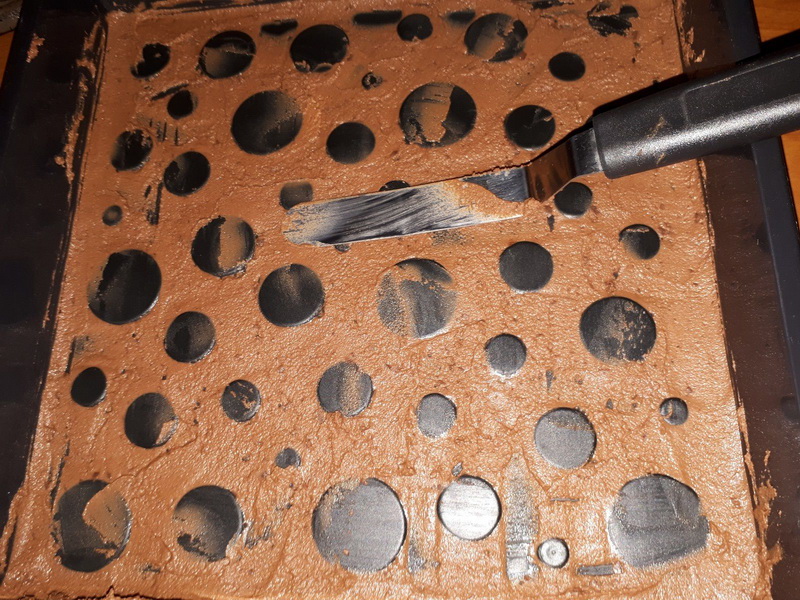 - Poser la toile décor bulles au fond du moule carré nettoyé, verser un peu de mousse et étaler à la spatule dans les bulles.