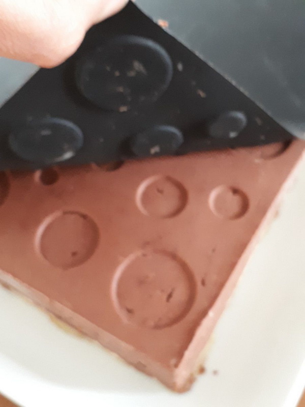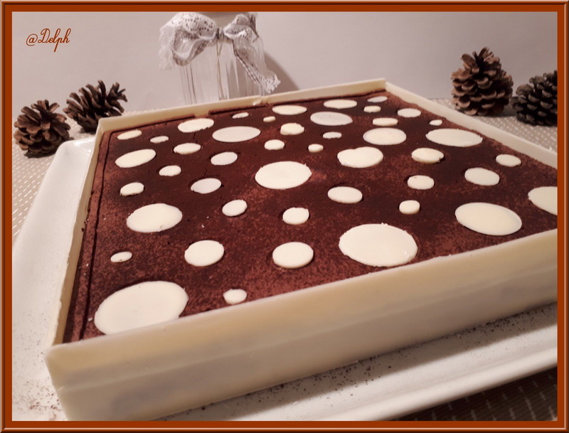 J’ai utilisé mon moule Flexipat Carré Demarle avec une toile décor bulles, et la recette est tirée du livre Du relief dans l’assiette.