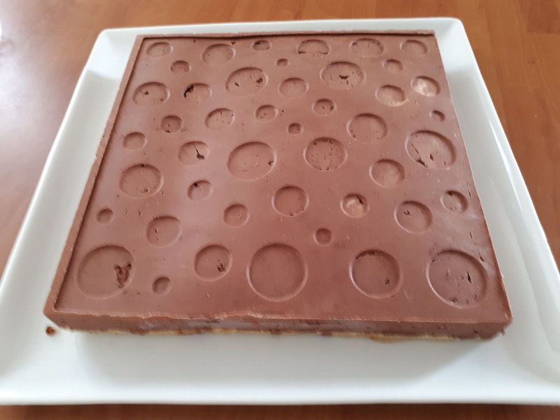 - Placer 2 heures au congélateur, lorsque c’est bien congelé, vous pouvez préparer votre mousse au chocolat et démouler la dacquoise recouverte du croustillant (attention mettre au frais il ne faut pas que cela décongèle, il faut donc être assez rapide).