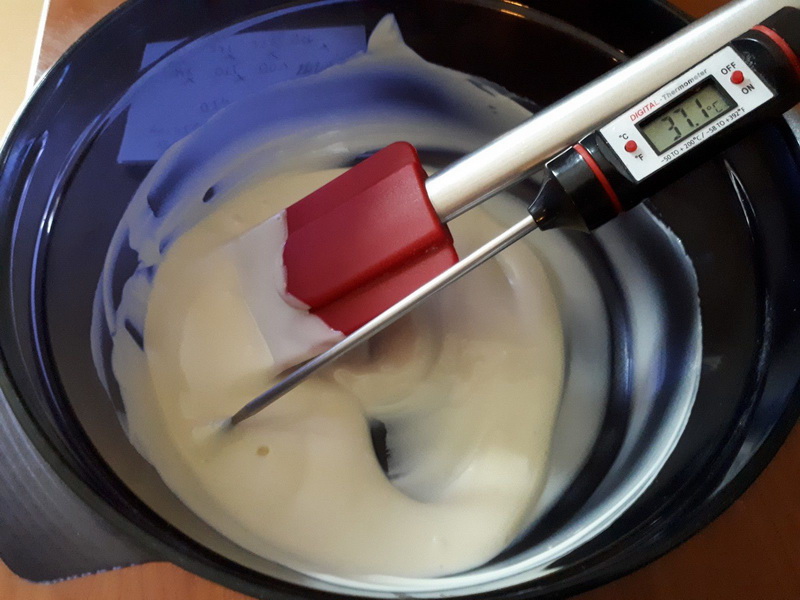 - Attendre que le chocolat descende en température à 33°, intégrer le mycryo et mélanger;