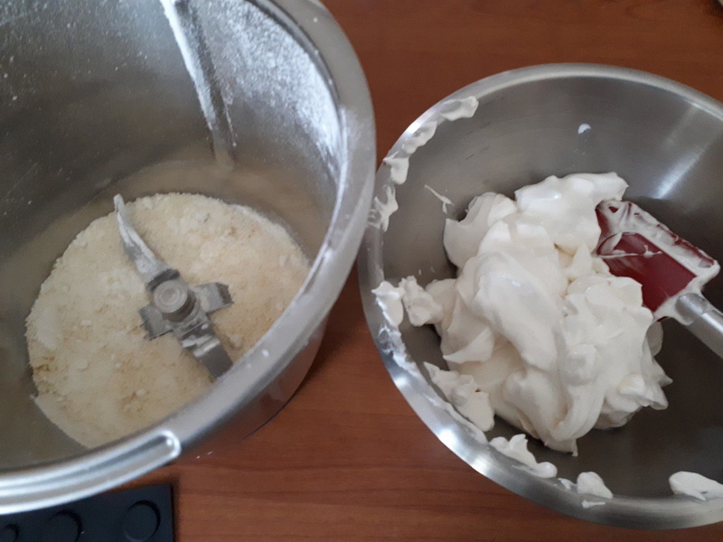 - Mettre dans le bol la poudre d’amande, le sucre glace et la farine puis mélanger 20sec/Vit3. Incorporer petit à petit ce mélange dans les blancs en neige à l’aide d’une maryse.